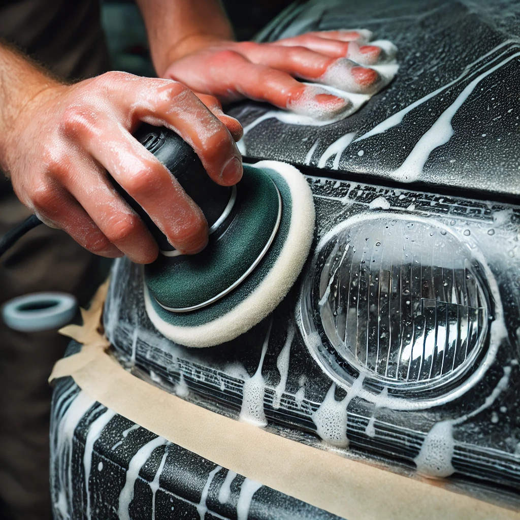 Våtslipning är ett viktigt steg för att ta bort djupare repor och oxidering från strålkastarnas yta.